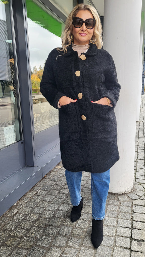 Dieser Mantel ist mehr als nur eine Jacke – er ist ein modisches Statement. Die großen, kontrastierenden Knöpfe setzen markante Akzente und unterstreichen das zeitlose Design. Der klassische Reverskragen ermöglicht vielseitiges Styling, ob hochgeschlossen mit einem zarten Rollkragenpullover oder offen über einer eleganten Bluse.