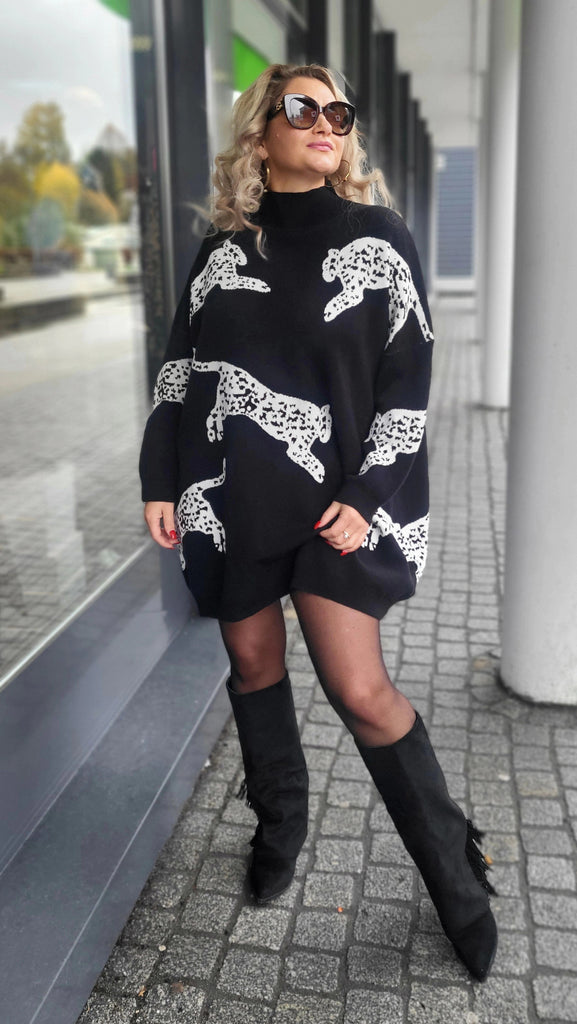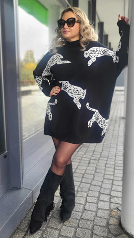 Ein schwarzes, gemütliches Oversize-Strickkleid mit einem coolen Stehkragen. Das absolute Highlight ist das krass coole Muster: springende weiße Jaguare im kontraststarken Schwarz-Weiß-Look. Einfach der Hammer!