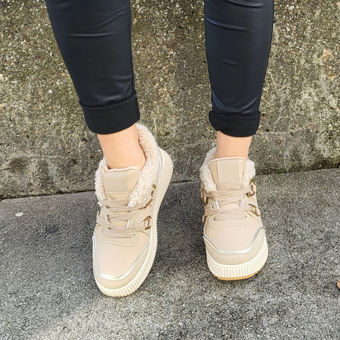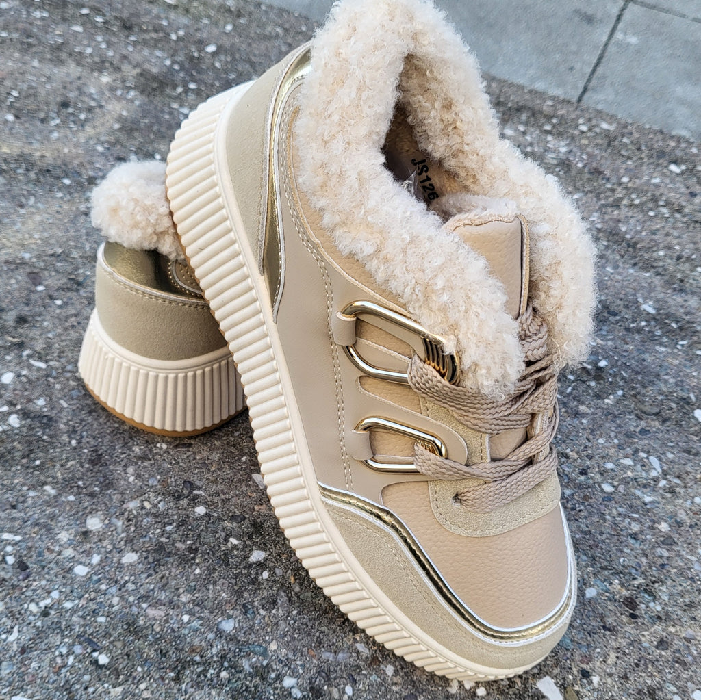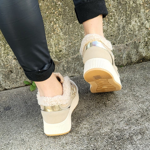 Unsere neuen Khaki & Gold Sneaker mit flauschige 🐻Teddy-Futter ist ein Traum für die Füße und die goldenen Akzente geben jedem Outfit das gewisse Etwas. 💯😍